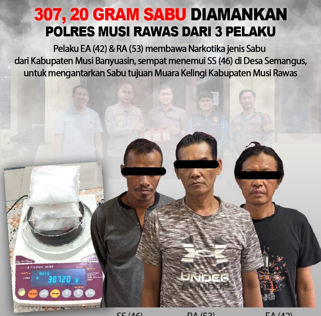 “Awalnya pada Kamis (9/10/2025) Satuan Reserse Narkoba Polres Musi Rawas mendapatkan informasi dari masyarakat bahwa akan adanya pengiriman Narkotika jenis Sabu dari Kabupaten Musi Banyuasin dengan tujuan Kecamatan Muara Kelingi Kabupaten Musi Rawas, lalu kami melakukan analisis dan pemetaan target, melalui join investigation antara Sat Res Narkoba dengan Polsek Kelingi, 3 (tiga) pelaku berhasil diamankan dengan barang bukti 3 kantong diduga narkoba jenis sabu, saat itu Pelaku EA (42) dan Pelaku RA (53) membawa sabu tersebut dari Musi Banyuasin menggunakan kendaraan minibus merk sigra, sempat mampir ke Desa Semangus Kecamatan Muara Lakitan untuk menemui Pelaku SS (46), setelah terjadi pemukatan ketiga Pelaku bergerak untuk mengantarkan sabu tersebut ke wilayah Muara Kelingi, karena kami tidak mau kehilangan jejak, selanjutnya Polsek Muara Kelingi kami perintahkan untuk melakukan tindakan kepolisian di lapangan, alhamdulillah, dini hari pukul 01.30 WIB (10/10/25) ketiga Pelaku berhasil diamankan dengan barang bukti 3 kantong narkotika jenis sabu” jelas Kapolres.