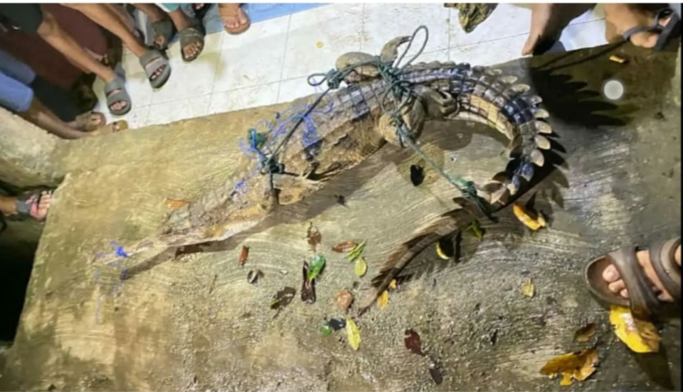 Lalu, Hasan, memeriksa jaringnya, dan ditemukan se ekor buaya yang berukuran sedang. Selanjutnya, Hasan, memanggil warga untuk membantu mengamankan buaya tersebut, dengan cara diikat dengan tali.