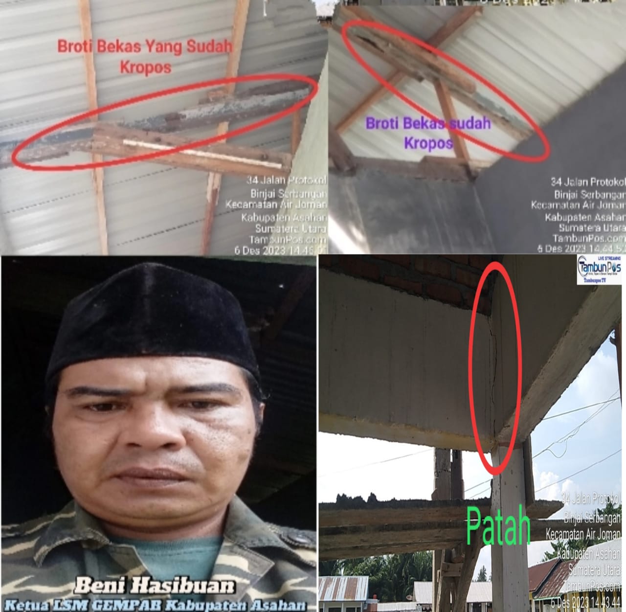 Pantauan awak media saat berada disana melihat cor-coran pinggang bangunannya patah dan tidak ada besi pengikatnya,beban yang ditahan oleh tiang bangunan bertambah karena diatas ada penambahan batu setinggi satu meter,broti kerangka seng menggunakan kayu bekas yang sudah lapuk dan Keropos dimakan rayap, Jumat (12/01/2024).