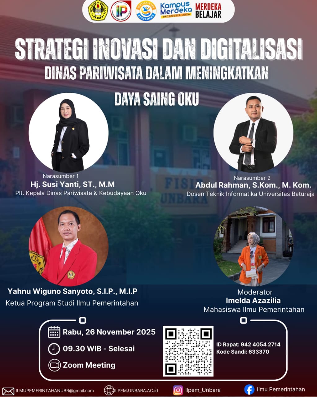 BATURAJA (SUMSEL) SUARAPANCASILA.ID – Program Studi Ilmu Pemerintahan (Prodi Ilmu Pemerintahan) Universitas Baturaja (Unbara) sukses menyelenggarakan webinar strategis bertajuk, “Strategi Inovasi dan Digitalisasi Dinas Pariwisata dalam Meningkatkan Daya Saing OKU”. Acara yang berlangsung pada Rabu, 26 November 2025, melalui Zoom Meeting, tersebut mendapat sambutan antusias dari berbagai kalangan.