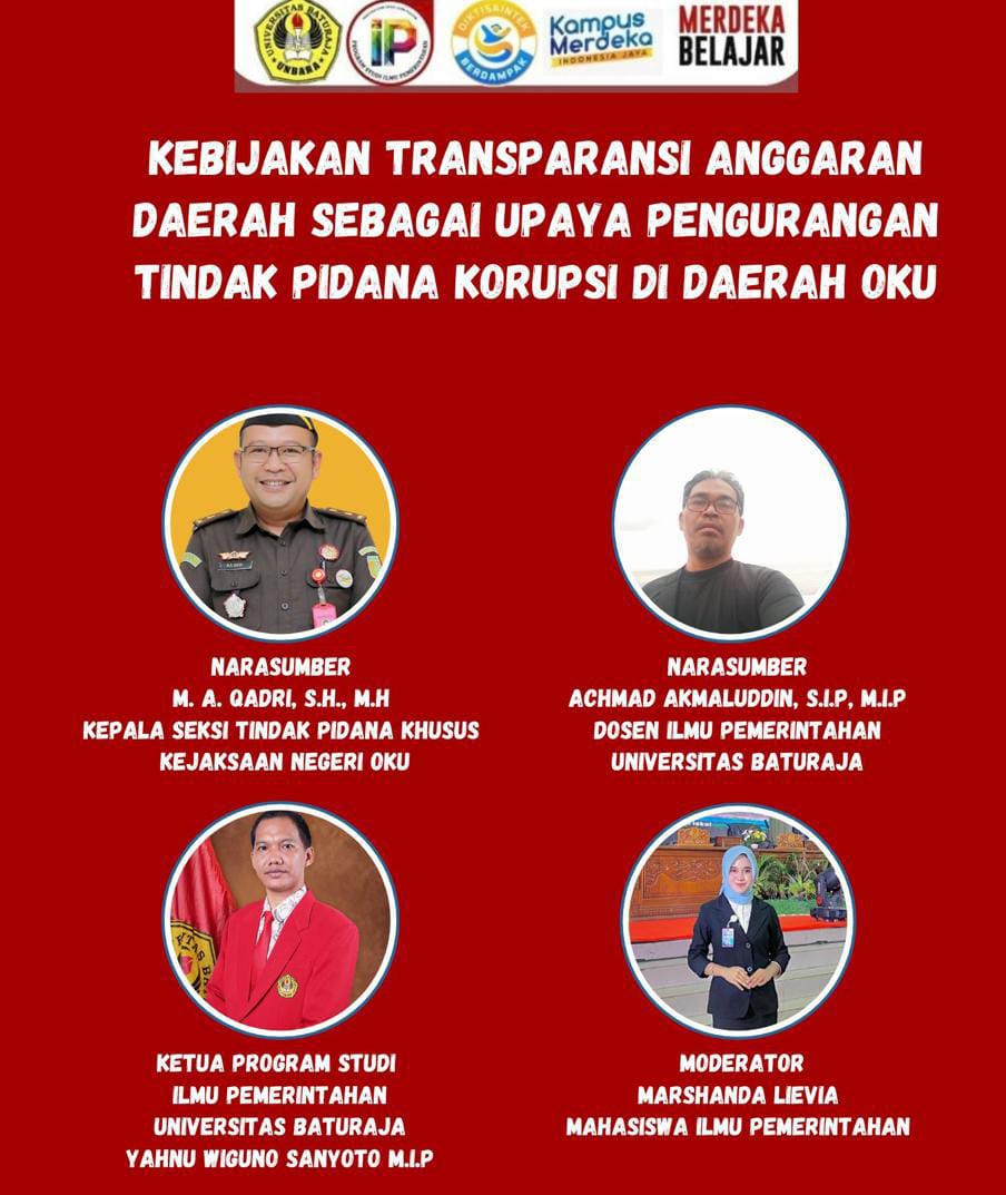 Kegiatan yang digelar secara daring melalui Zoom Meeting pada Rabu (12/11) pukul 09.00 WIB ini menghadirkan dua narasumber kompeten di bidangnya, yaitu M. A. Qadri, S.H., M.H., Kepala Seksi Tindak Pidana Khusus Kejaksaan Negeri OKU, serta Achmad Akmaluddin, S.I.P., M.I.P., Dosen Ilmu Pemerintahan Universitas Baturaja. Acara dipandu oleh Marshanda Lievia, mahasiswa Ilmu Pemerintahan, dengan sambutan pembuka dari Yahnu Wiguno Sanyoto, M.I.P., selaku Ketua Program Studi Ilmu Pemerintahan Universitas Baturaja.