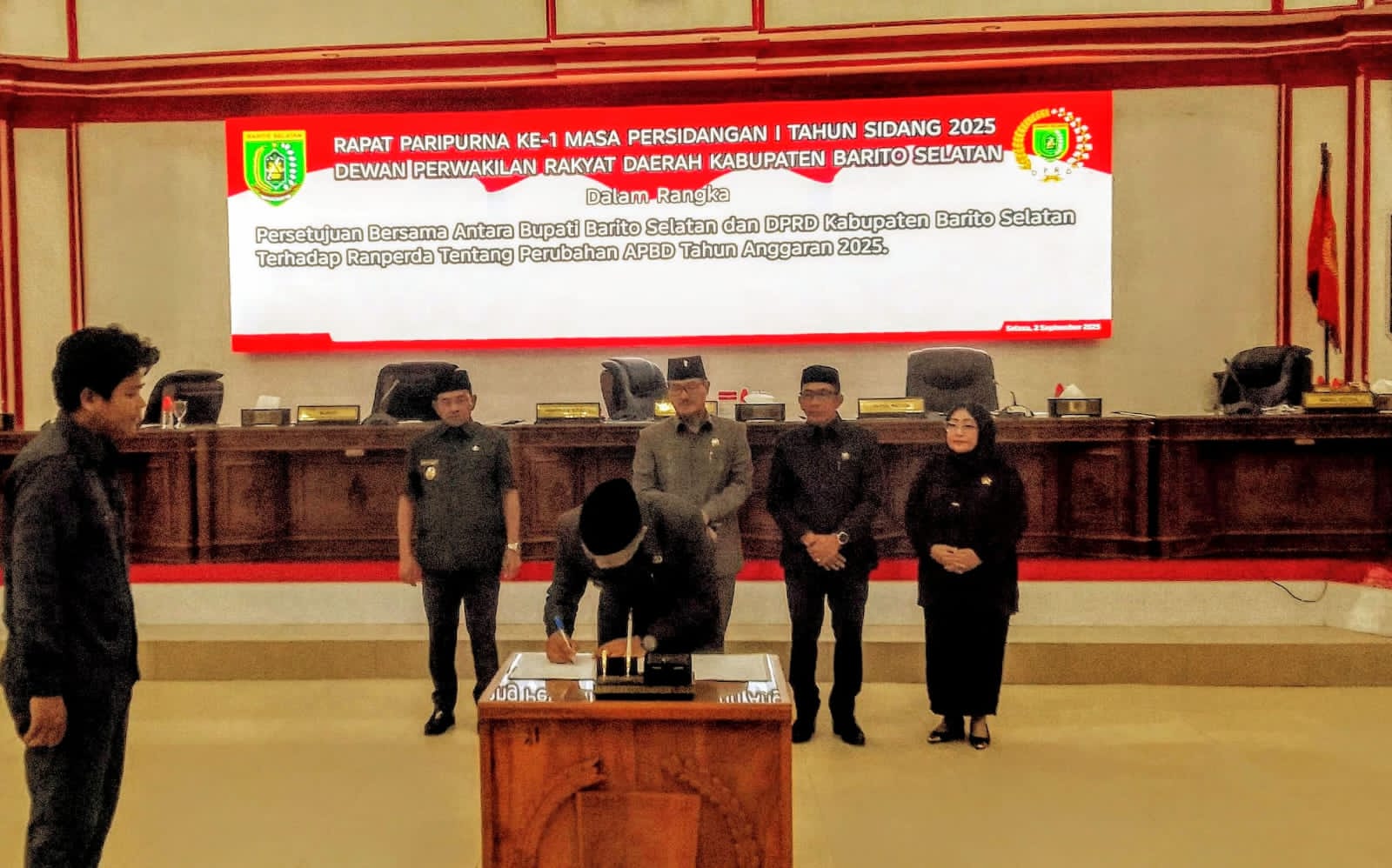 Penandatanganan persetujuan bersama antara Bupati Barito Selatan dengan pimpinan DPRD Kabupaten Barito Selatan tersebut berlangsung di Graha Paripurna DPRD Kabupaten Barito Selatan, Selasa 2 September 2025.