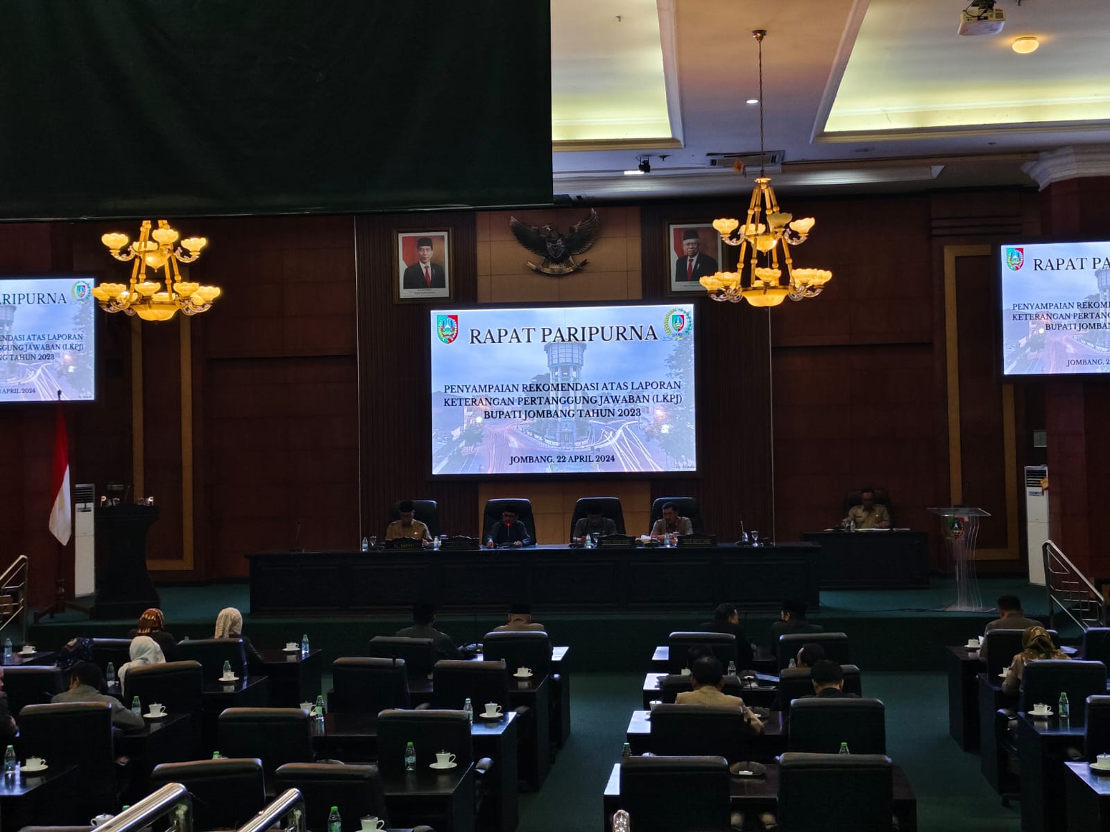 JOMBANG, SUARAPANCASILA.ID – Dewan Perwakilan Rakyat Daerah (DPRD) Kabupaten Jombang menyelenggarakan Rapat Paripurna Penyampaian Rekomendasi Atas Laporan Keterangan Pertanggung Jawaban (LKPJ) Bupati Jombang Tahun 2023. Rapat Paripurna diselenggarakan di Ruang Rapat Gedung DPRD Kabupaten Jombang pada Senin (22/04/2024) pagi.