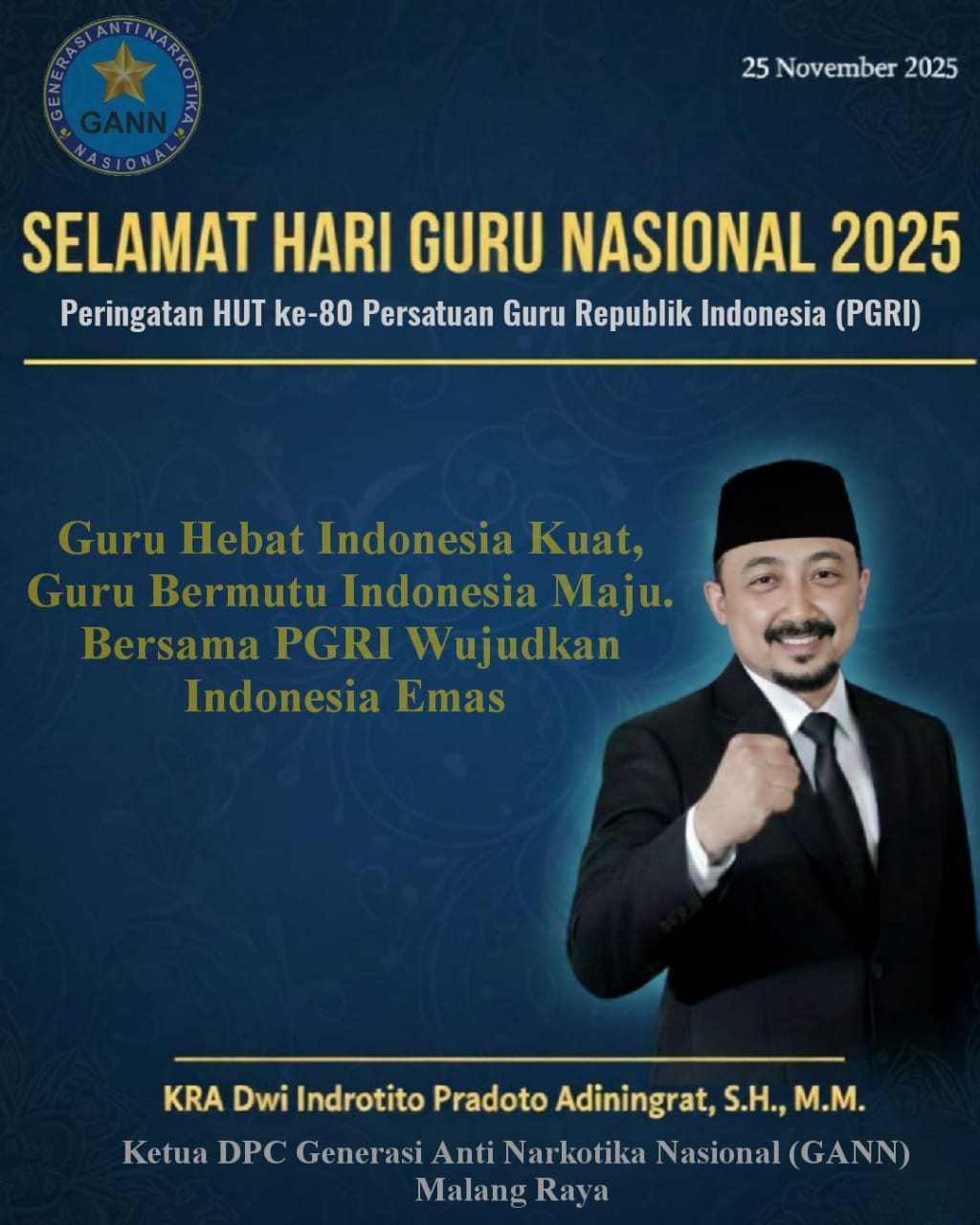 KOTA MALANG (JATIM), SUARAPANCASILA,ID – Momentum Hari Guru Nasional (HGN) tahun 2025 yang bertepatan dengan Hari Ulang Tahun (HUT) ke-80 Persatuan Guru Republik Indonesia (PGRI) disambut hangat oleh Ketua Dewan Pimpinan Cabang Gerakan Anti Narkotika Nasional (DPC GANN) Malang Raya, KRA. Dwi Indrotito Pradoto Adiningrat, S.H., M.M.
