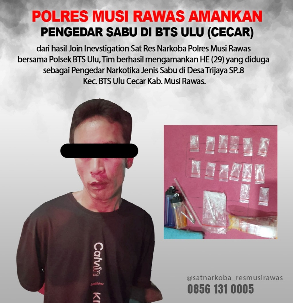 “Berawal informasi masyarakat yang masuk ke Nomor yanduan Narkoba 0856 131 0005, selanjutnya kami menganalisa dan melaksanakan rangkaian penyelidikan terkait peredaran narkoba pada sasaran lokasi di Desa Trijaya, setelah dilakukan pemetaan, guna percepatan kami perintahkan Kasatres Narkoba berkoordinasi dengan Polsek BTS Ulu (cecar) untuk melakukan tindakan Kepolisian, kemudian pada (13/10/2025) sekira pukul 22.30 WIB, Pelaku HE (29) berhasil dibekuk dengan barang bukti 1 kantong plastik sedang diduga berisikan Narkotika jenis Sabu, 14 klip plastik kecil yang diduga berisikan Narkotika jenis Sabu, kami juga temukan 1 bal plastik kecil, 2 korek api, 1 alat hisap sabu (bong), yangmana diduga kuat Pelaku HE ini adalah masuk kategori pengedar sabu” jelas Kapolres.