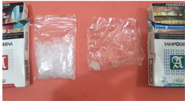 Dari tangan tersangka, anggota menyita BB diantaranya, satu bungkus kotak rokok filter yang didalamnya terdapat satu bungkus plastik klip ukuran sedang yang berisikan kristal putih diduga narkotika jenis sabu seberat bruto 10,14 gram, satu bungkus kotak rokok filter yang didalamnya terdapat, satu bungkus plastik klip ukuran sedang yang berisikan kristal putih diduga narkotika jenis sabu seberat bruto 0,66 gram, jadi total berat bruto keseluruhan barang bukti narkotika 10,78 gram.