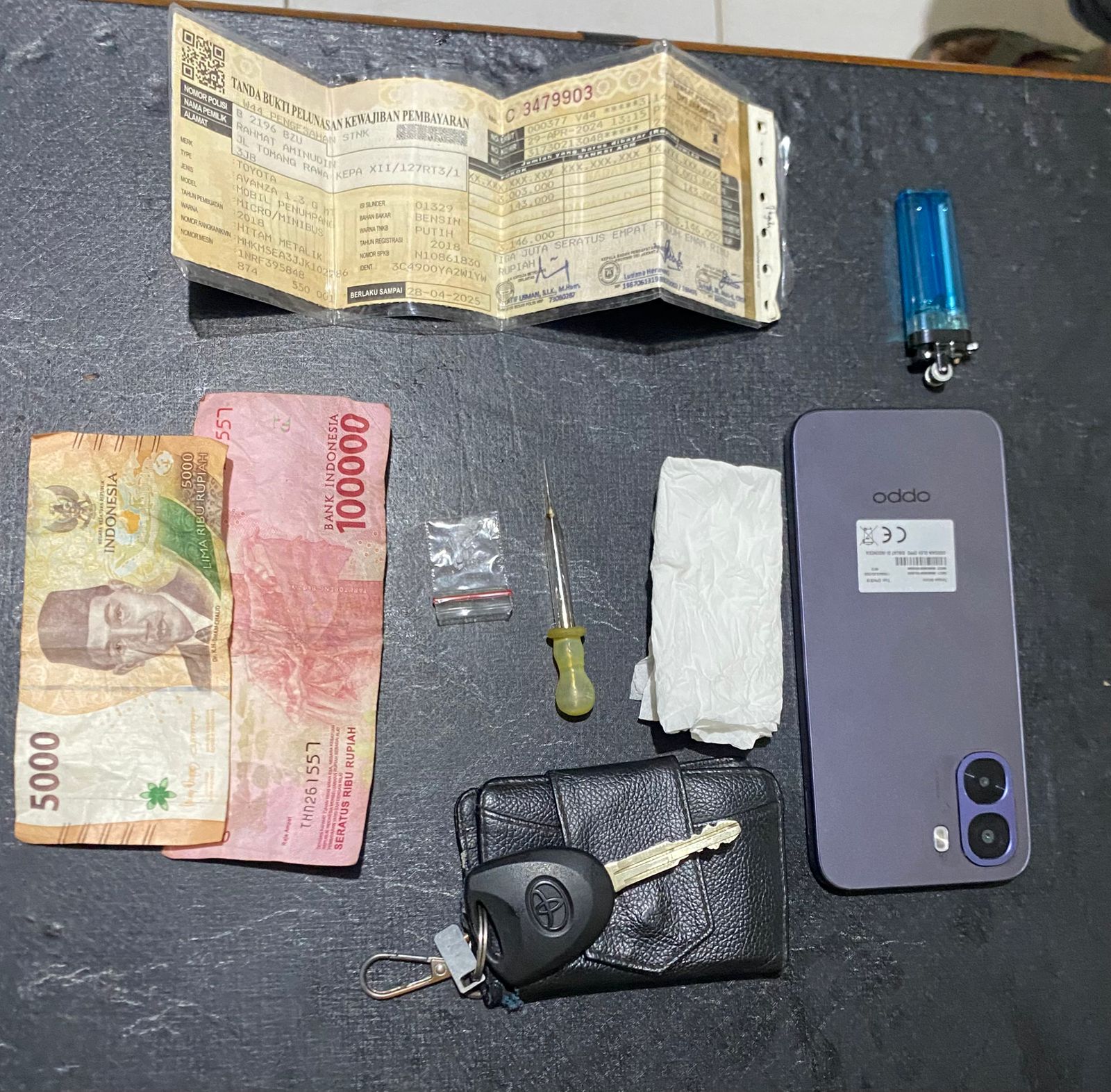 Barang bukti yang disita antara lain satu unit mobil Toyota Avanza, satu unit handphone, uang tunai Rp105.000,-, kaca pirek beserta pipet plastik modifikasi, korek api, dan jarum suntik.