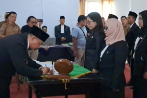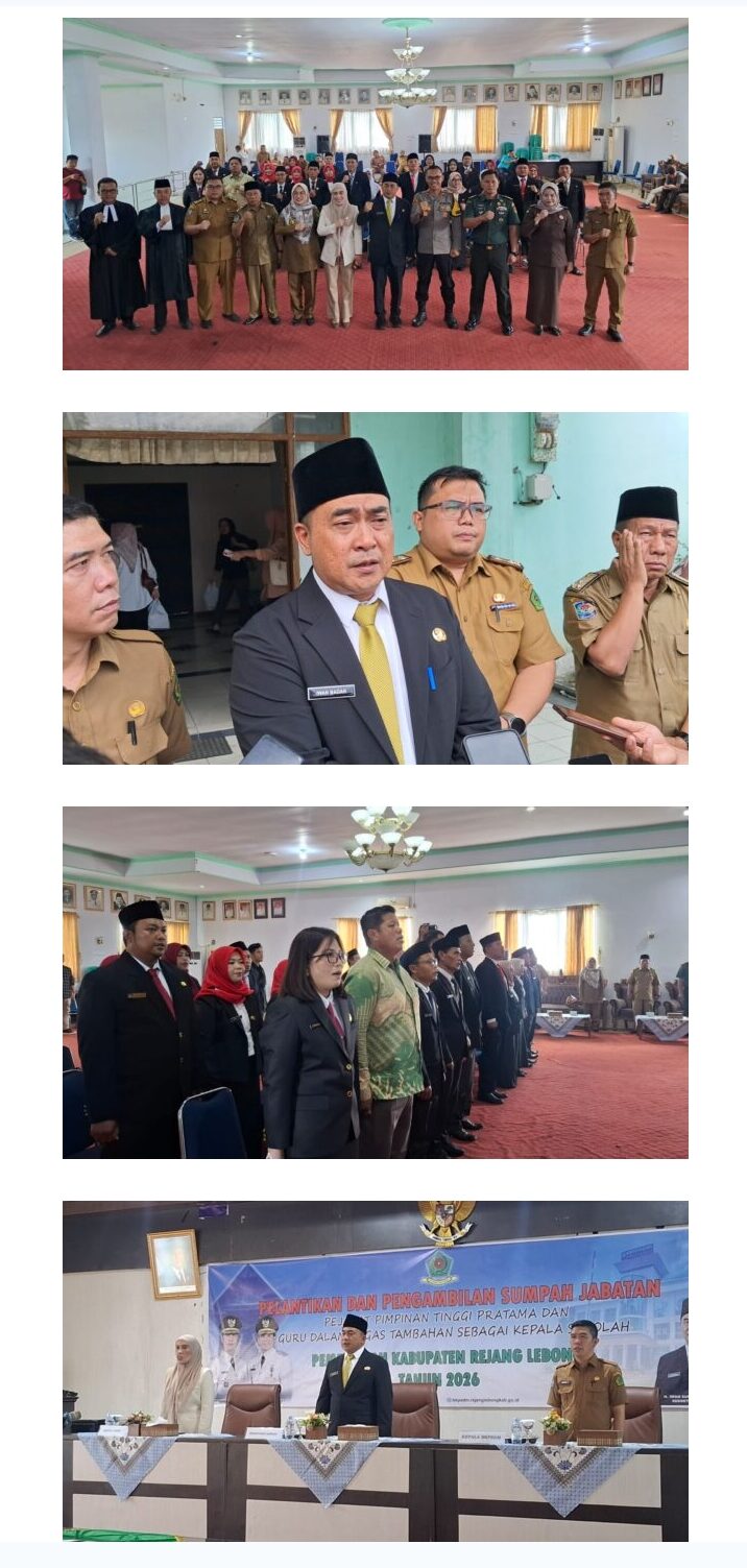 REJANG LEBONG (BENGKULU), SUARAPANCASILA.ID – Sekretaris Daerah (Sekda) Kabupaten Rejang Lebong Iwan Sumantri, S.E., M.M. memimpin pelantikan dan pengambilan sumpah jabatan Pejabat Pimpinan Tinggi Pratama serta guru yang diberi tugas tambahan sebagai kepala sekolah di lingkungan Pemerintah Kabupaten Rejang Lebong. Pelantikan berlangsung di Ruang Pola Pemkab Rejang Lebong, Selasa (3/2/2025), dan dihadiri unsur Forum Koordinasi Pimpinan Daerah (Forkopimda), para kepala Organisasi Perangkat Daerah (OPD), serta tamu undangan lainnya.
