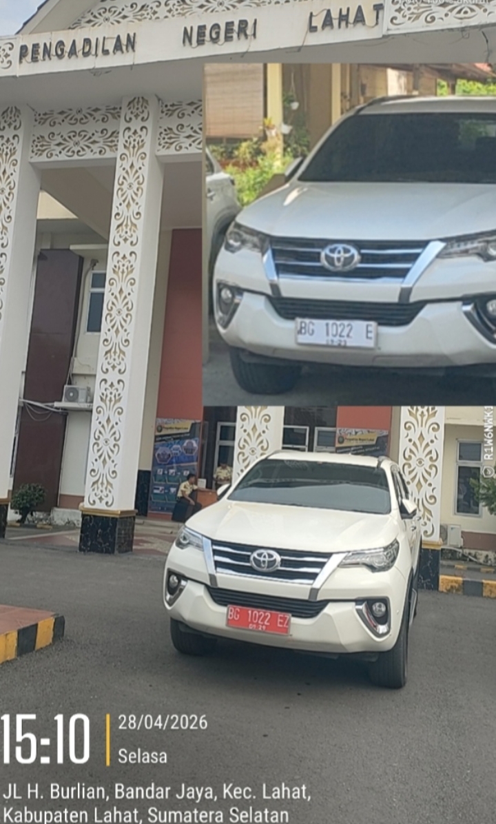 Namun, perkembangan terbaru Selasa 28 April 2026, pukul 15.10 Wib menunjukkan bahwa kendaraan yang sama kini telah menggunakan TNKB BG 1022 EZ (plat merah) terparkir didepan kantor Pengadilan Negeri Lahat