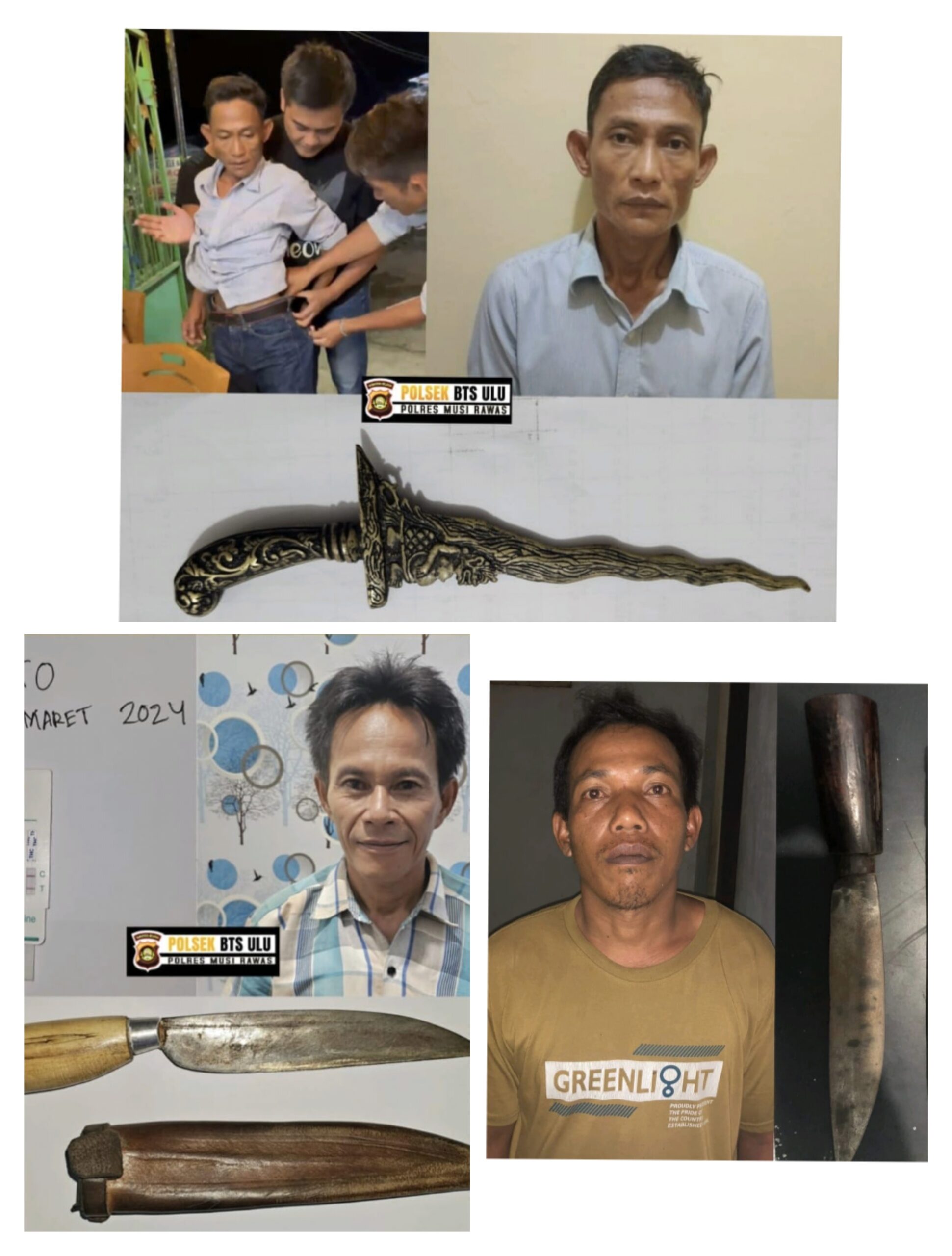 MUSI RAWAS-SUARAPANCASILA.ID-Polsek BTS Ulu bersama Polres Musi Rawas (Mura), berhasil meringkus terduga tiga pelaku kepemilikan Senjata Tajam (Sajam), jenis pisau dan keris, dalam satu hari, hanya saja diwaktu dan tempat berbeda.