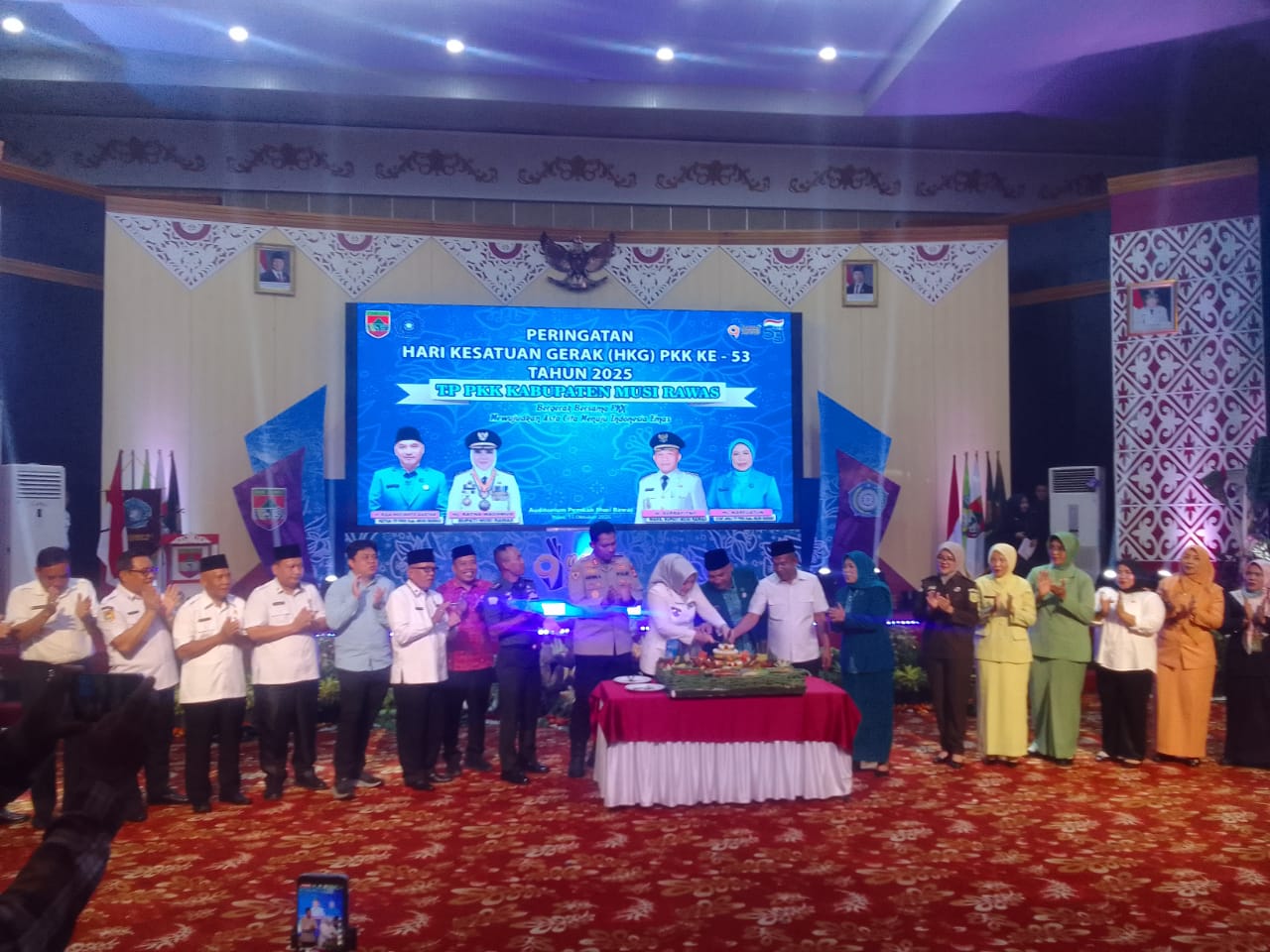 MUSI RAWAS (SUMSEL), SUARAPANCASILA.ID – Bupati Musi Rawas Hj Ratna Machmud didampingi Ketua TP PKK Mura H Riza Novianto Gustam, menggelar Peringatan Hari Kesatuan Gerak (HKG) PKK ke-53 Tahun 2025 mengusung tema “Bergerak Bersama PKK Mewujudkan Asta Cita Menuju Indonesia Emas”, bertempat di Auditorium Pemda Musi Rawas, Rabu (15/10/2025).