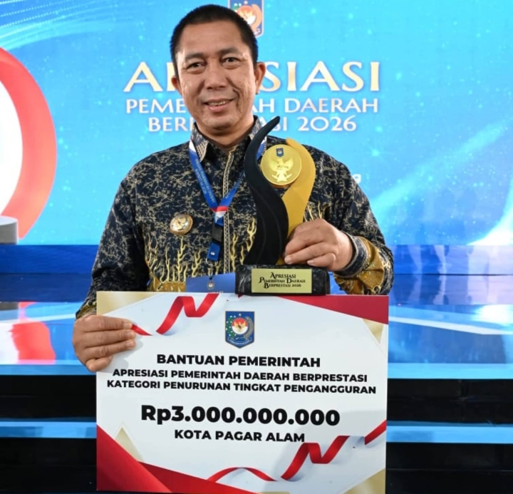 Apresiasi tersebut diserahkan oleh Sekjen Kemendagri Tomsi Tohir, kepada Wali Kota Pagar Alam Ludi Oliansyah, dalam acara Apresiasi Pemerintah Daerah Berprestasi 2026, yang berlangsung di Hotel Wyndham Palembang, pada Sabtu (25/04/2026).