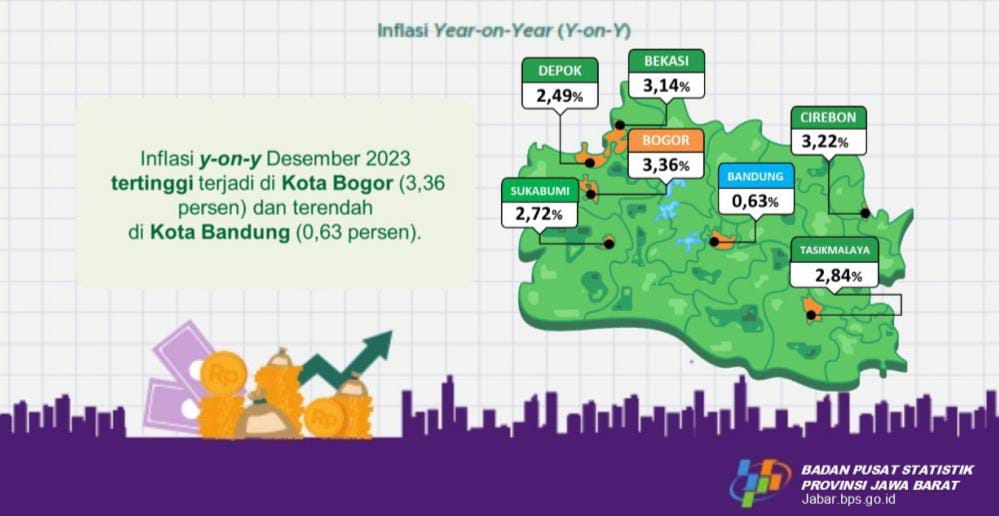 Inflasi tertinggi terjadi di Kota Bogor sebesar 3,36 persen. Sedangkan inflasi terendah terjadi di Kota Bandung sebesar 0,63 persen. Kota-kota lainnya juga mengalami inflasi year on year yaitu Kota Sukabumi 2,72 persen, Kota Cirebon 3,22 persen, Kota Bekasi 3,14 persen, Kota Depok 2,49 dan Kota Tasikmalaya 2,84 persen.