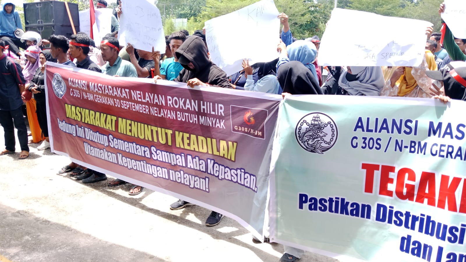 Aksi yang digelar di halaman kantor DPRD itu diwarnai spanduk besar bertuliskan “Masyarakat Menuntut Keadilan – Utamakan Kepentingan Nelayan!” Suasana memanas lantaran hingga aksi berlangsung, Bupati H. Bistamam maupun Wakil Bupati Jhoni Charles tak terlihat hadir menemui massa.