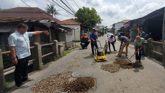 Jajaran Pemdes turun langsung melakukan perbaikan jalan berlubang yang berlokasi tepat di depan Kantor Desa Talagasari.