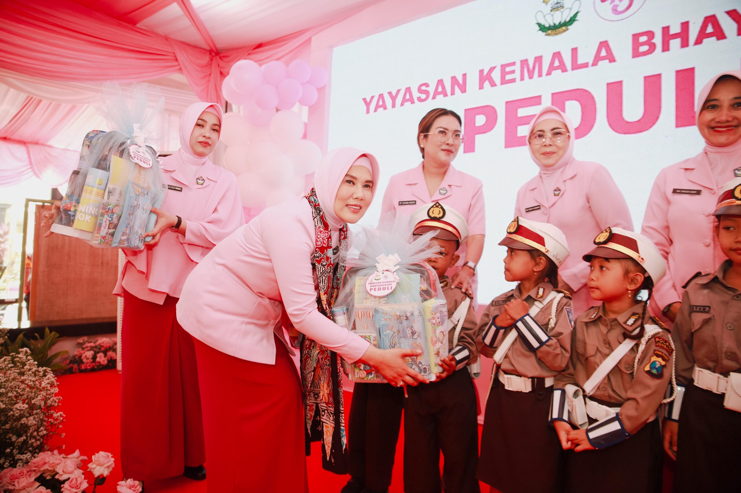 JOMBANG (JATIM).SUARAPANCASILA.ID – Anak-anak TK Yayasan Kemala Bhayangkari 88 Jombang tampak ceria dan senang saat mendapatkan makan bergizi gratis dan juga kotak jajan hingga alat tulis dari Wakil Ketua Bhayangkari Daerah Jawa Timur Ny. Vitha Royce.