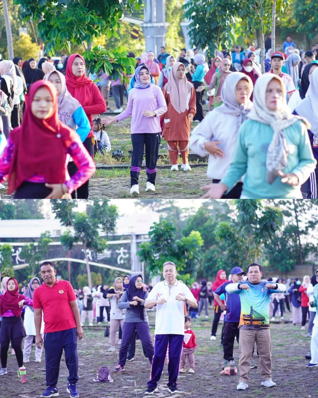 Ratusan peserta mengikuti senam dengan antusias, mengikuti gerakan yang dipandu instruktur senam secara energik dan serempak. Suasana kekeluargaan terasa kuat di tengah semangat menjaga kebugaran tubuh.