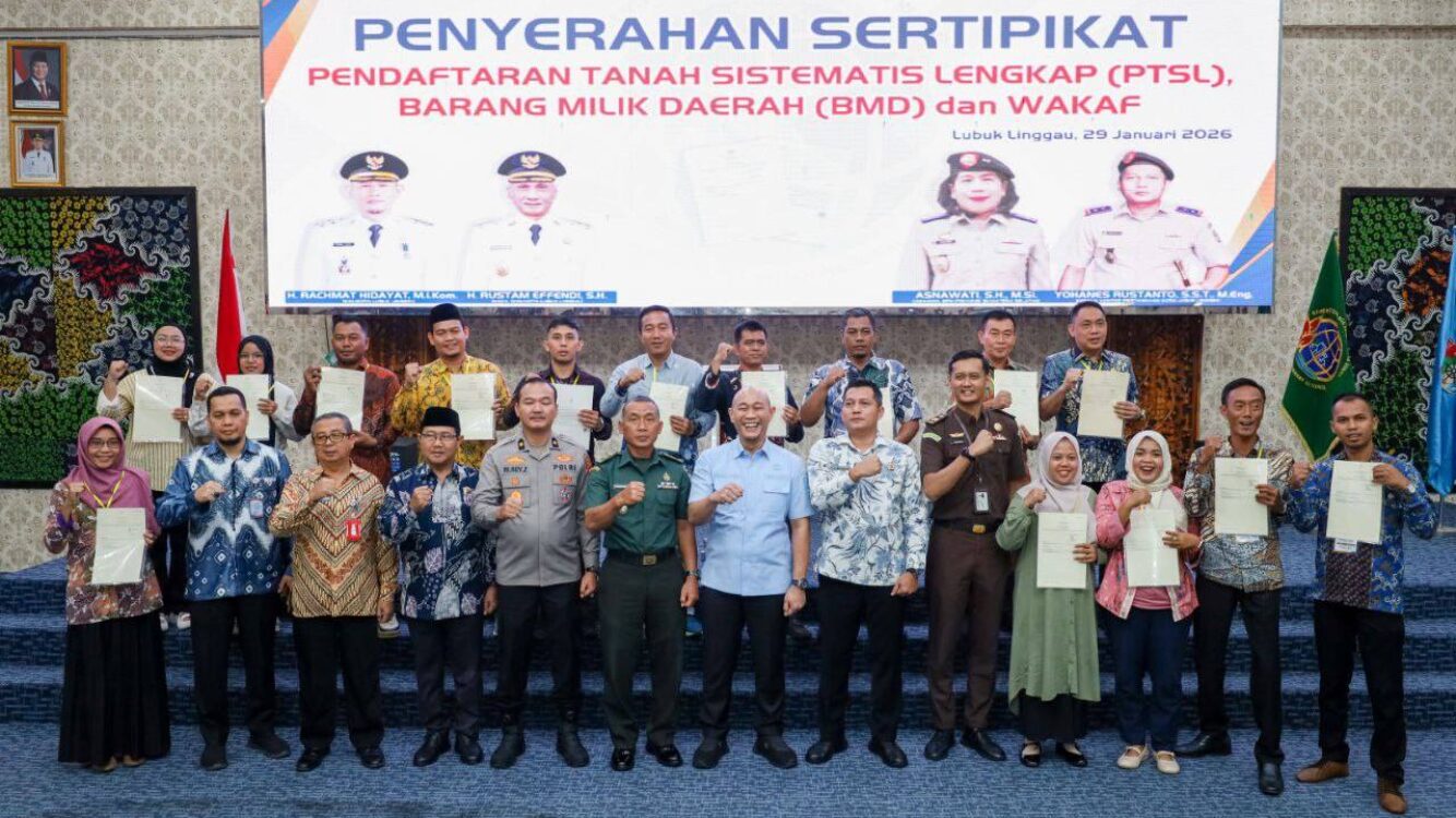 LUBUK LINGGAU (SUMSEL), SUARAPANCASILA.ID – Wali Kota Lubuk Linggau, H. Rachmat Hidayat, menyerahkan secara simbolis sertifikat Pendaftaran Tanah Sistematis Lengkap (PTSL) Barang Milik Negara (BMD) dan tanah wakaf kepada masyarakat. Kegiatan tersebut berlangsung di Cinema Hall Bukit Sulap, Pemerintah Kota Lubuk Linggau, Kamis (29/1/2026).